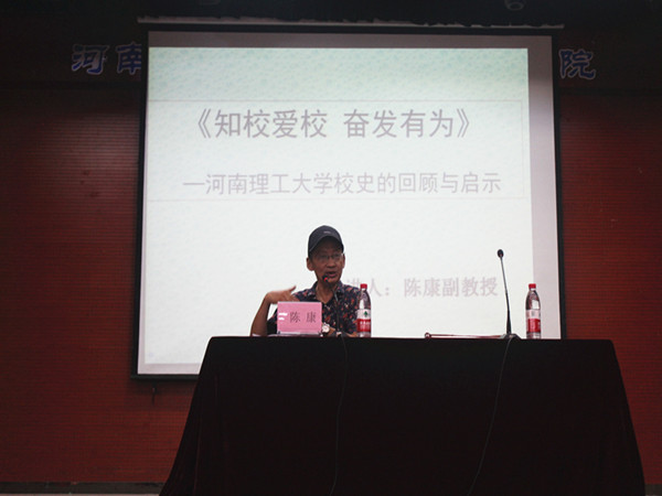 陈康教授以《知校爱校,奋发有为——河南理工大学校史的回顾与提示》为题,通过详实的资料、珍贵的校史照片向同学们呈现了河南理工大学自1909年建校至今,历经百年的不同风貌。他将我国近代史、煤炭产业发展与学校发展相结合,用幽默风趣的语言为同学们娓娓道来。介绍了河南理工大创办的历史背景、办学历程以及在抗战时期坚持办学的不凡历程。并从学校科研创新、文化传承、兄弟院校、知名校友等角度多层次剖析了我校的发展潜力。