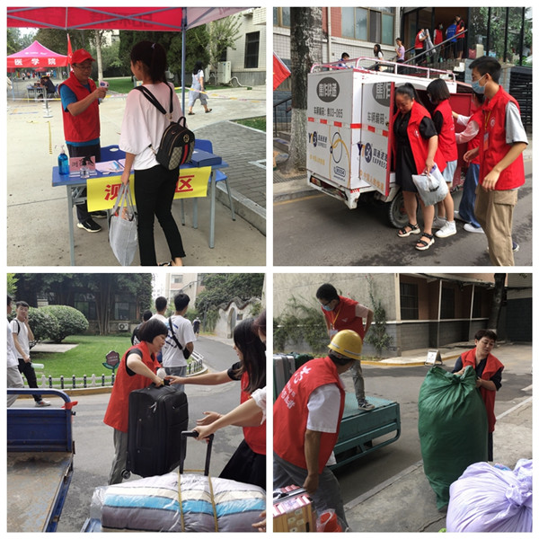 早上8点志愿者们身着红色志愿服、头戴红色志愿帽,精神饱满、面带笑容出现在工作岗位上。按照既定安排,志愿者们分别在东门迎接新生、在学院报到点测量体温、在宿舍楼下帮助新生搬运行李,为每一位新生提供力所能及的帮助