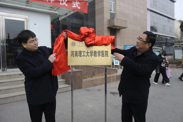 在学校相关人员和焦煤中央医院医护人员的共同见证下和热烈的掌声中,余本胜、薛喜庆共同为教学医院揭牌。