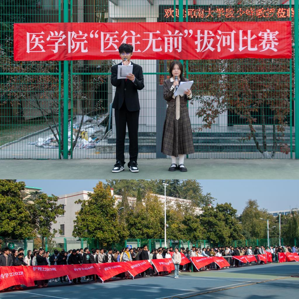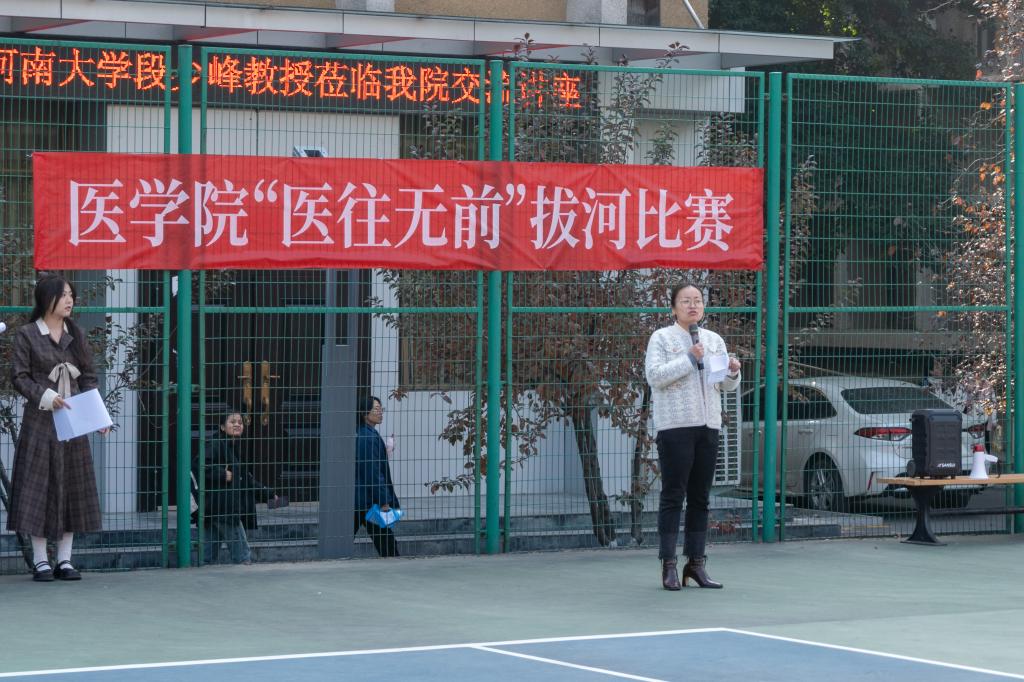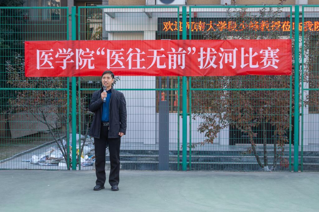 医学院党委书记张向锋同志宣布医学院“医往无前”拔河比赛正式开始,并为拔河比赛吹首哨。