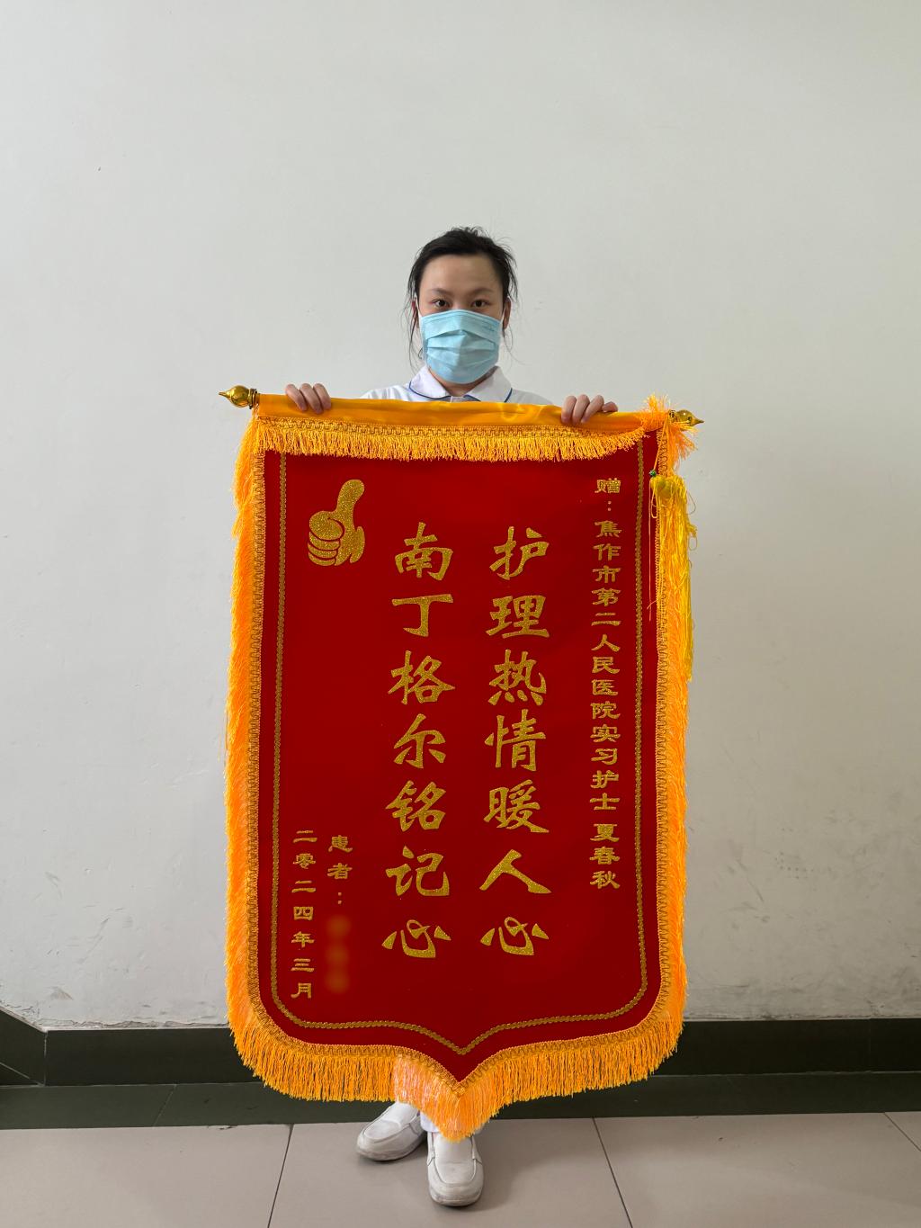 春满人间的三月,河南太阳成集团tyc122cc入口护理学专业大四实习生夏春秋同学在实习医院收到了一份特殊的礼物。河南理工大学第一附属医院骨科一区的患者郭某,将一面“南丁格尔铭记心,护理热情暖人心”的锦旗挂到了科室门口。这面锦旗不仅是对夏春秋同学的赞扬,更是对整个医护团队的认可和鼓励。