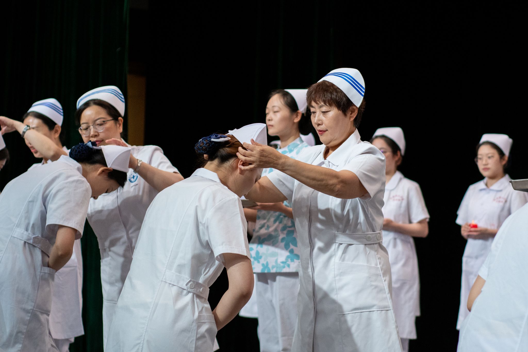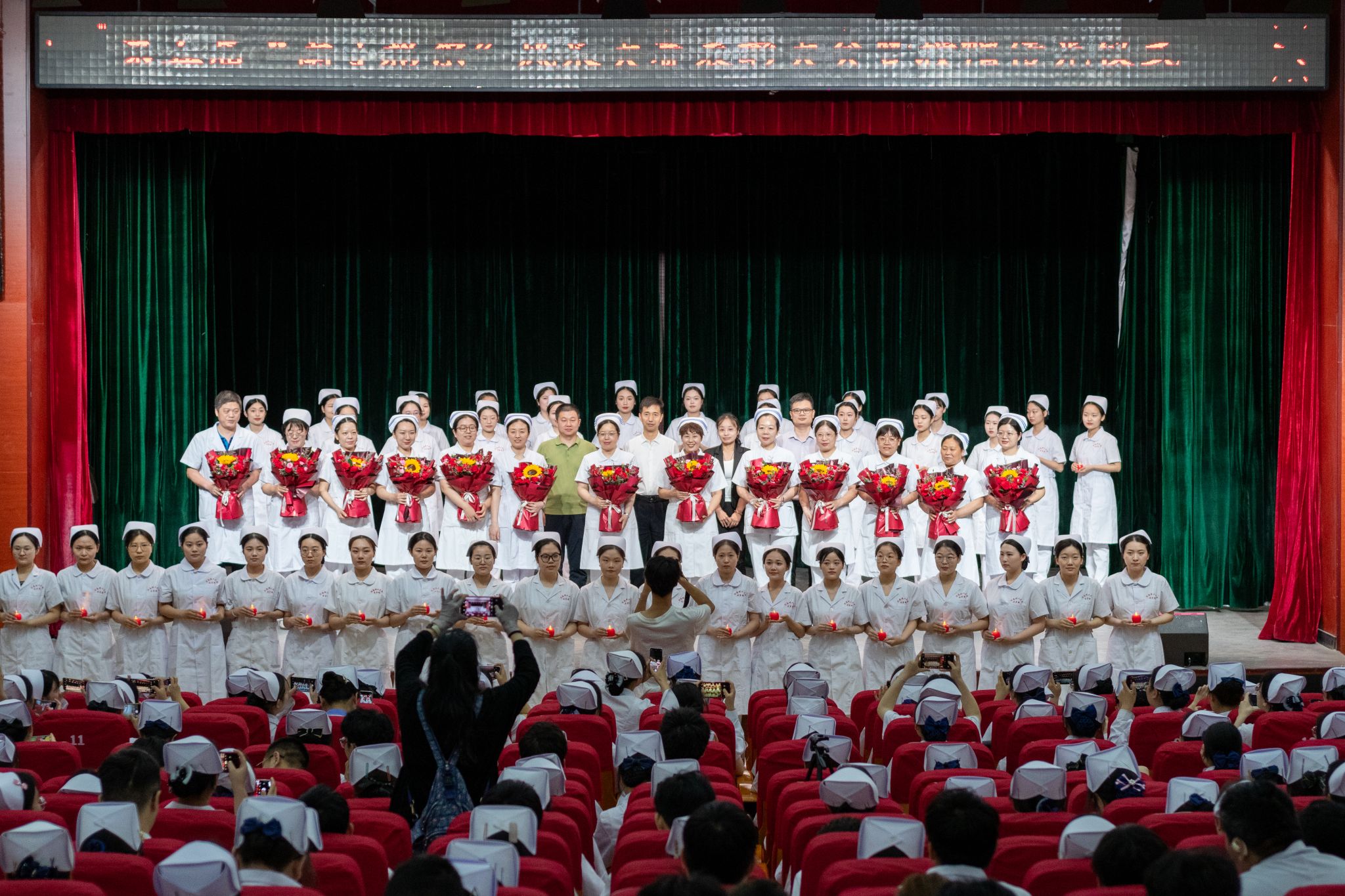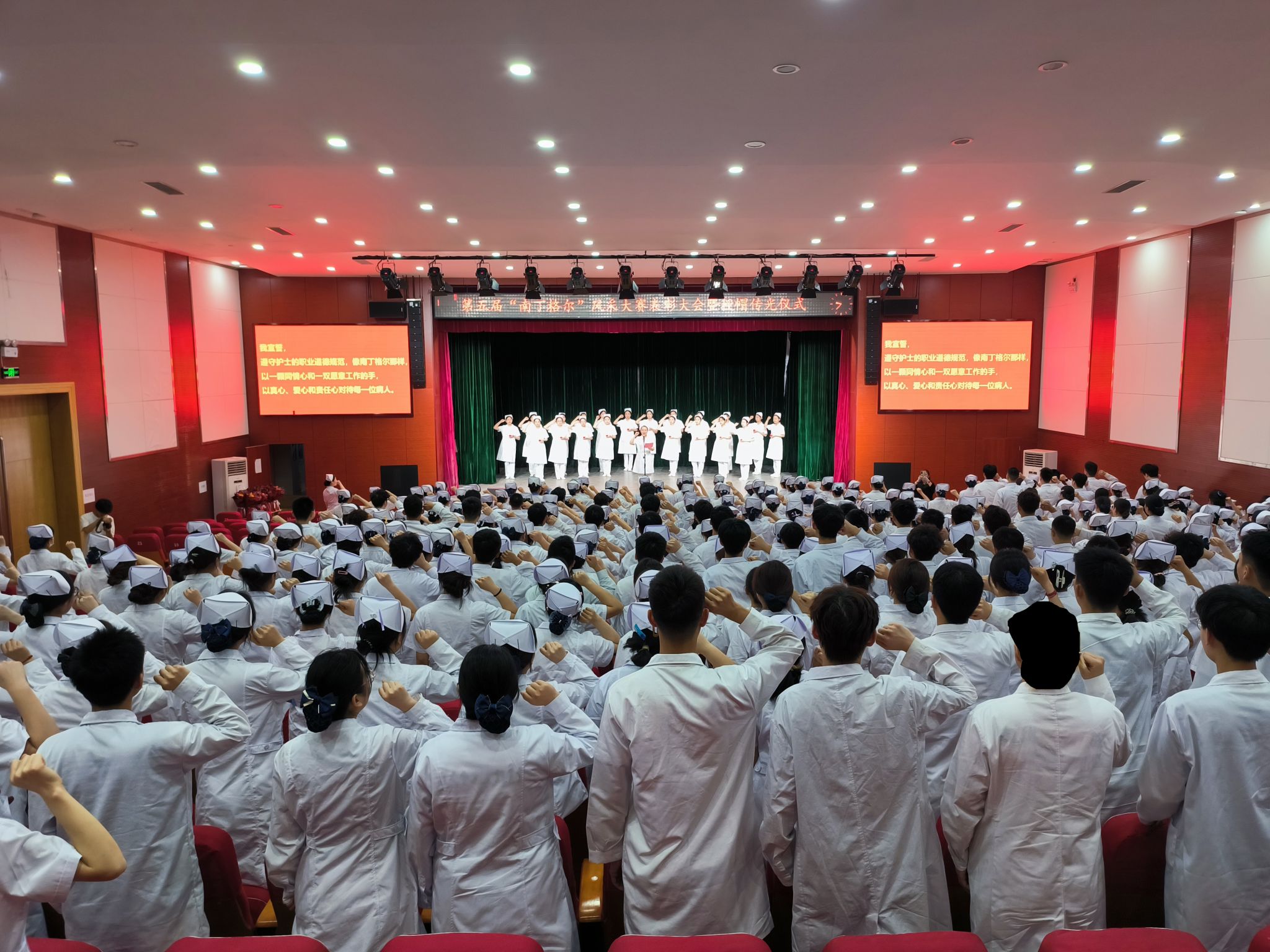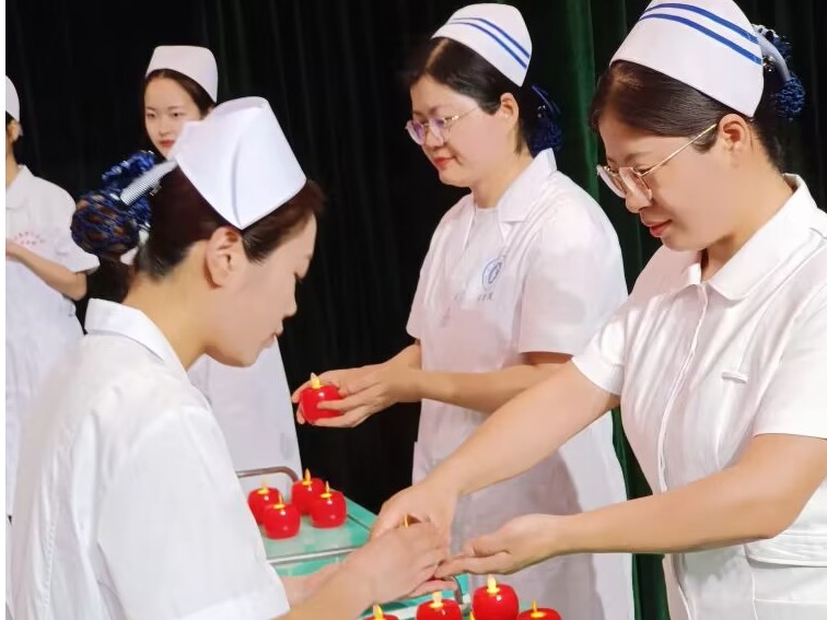 大会最后举行了庄重的授帽传光仪式。在庄严的乐曲声中,护理前辈们为护生们戴上象征圣洁的燕尾帽,并传递红烛,象征着护理精神的传承。护生们庄严宣誓,表达了她们献身护理事业、奉行人道主义精神、坚守救死扶伤信念的决心。