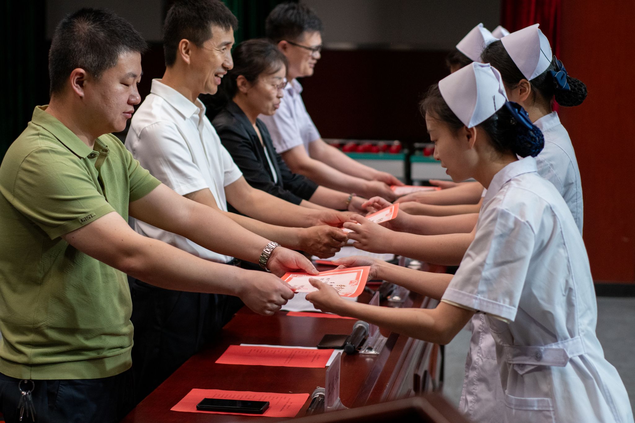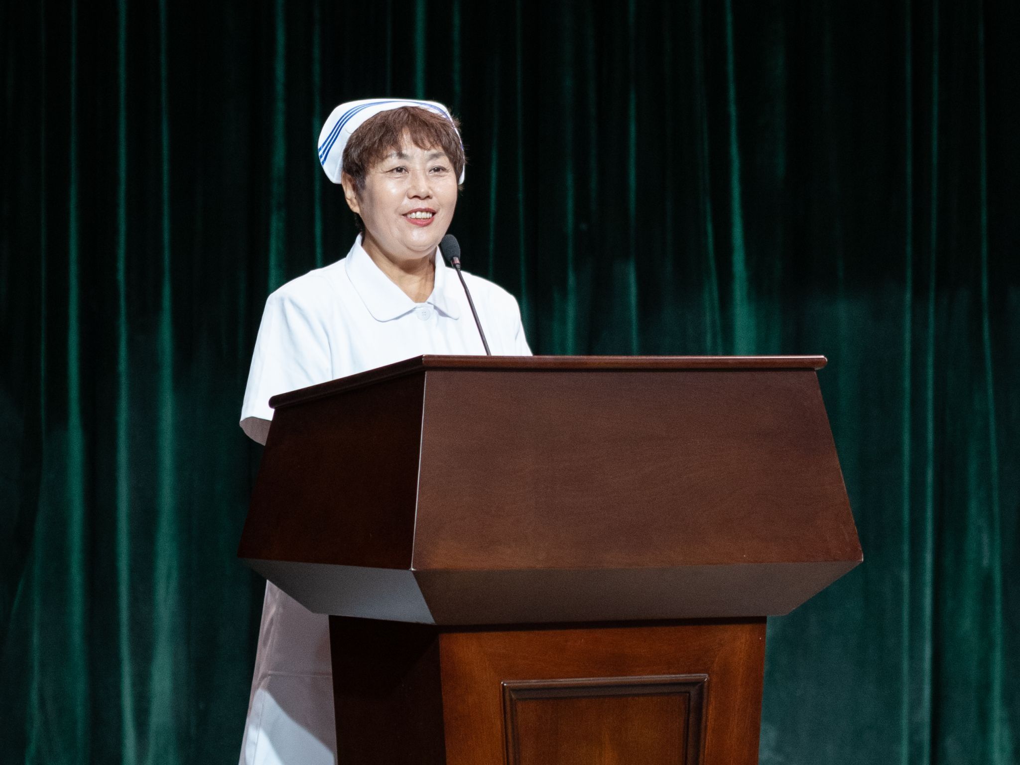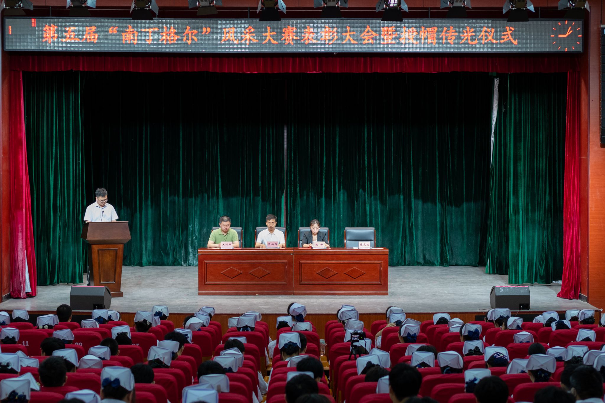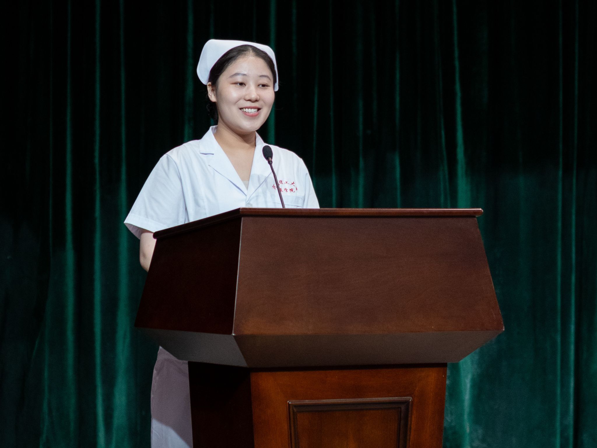 大会最后举行了庄重的授帽传光仪式。在庄严的乐曲声中,护理前辈们为护生们戴上象征圣洁的燕尾帽,并传递红烛,象征着护理精神的传承。护生们庄严宣誓,表达了她们献身护理事业、奉行人道主义精神、坚守救死扶伤信念的决心。