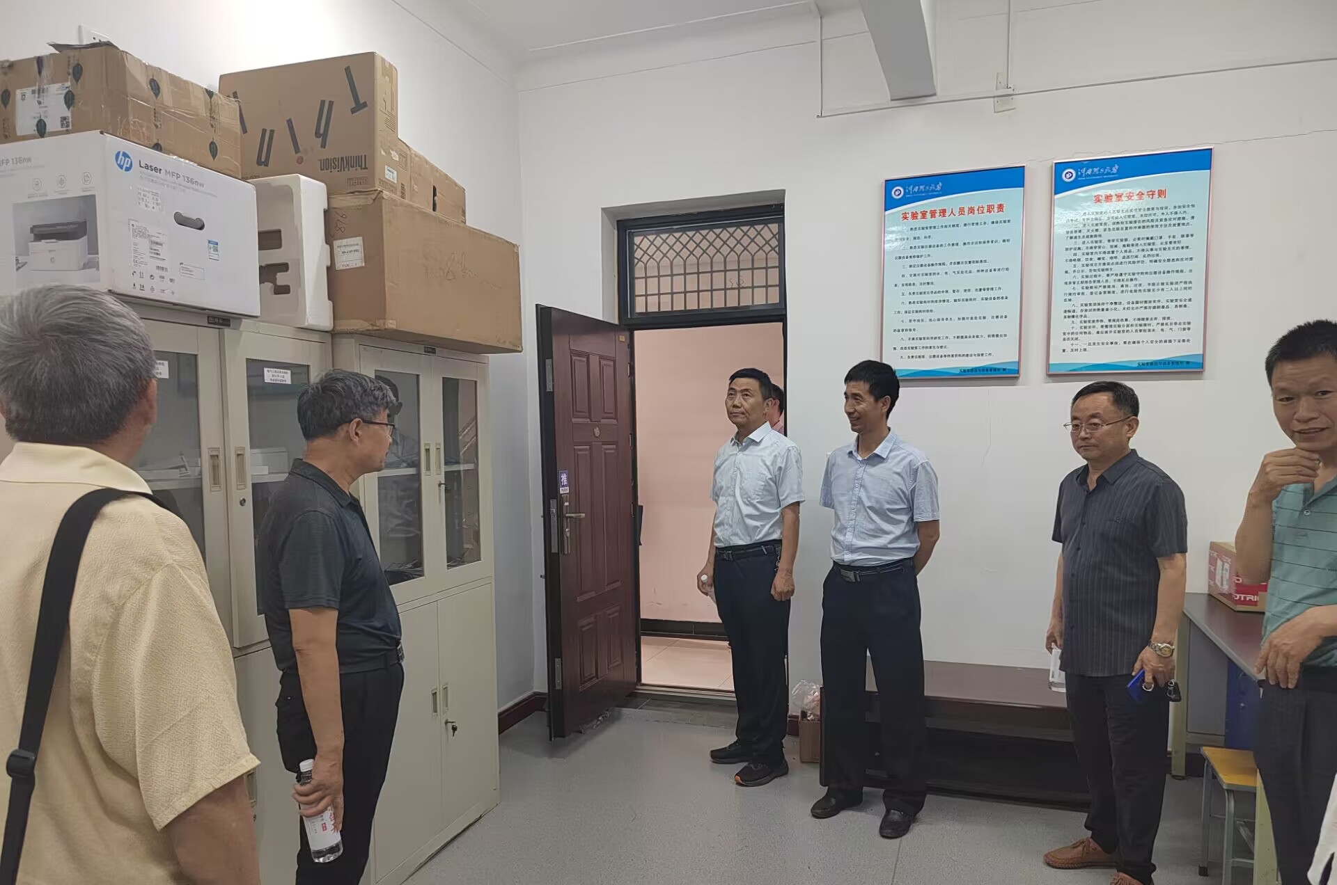 2024年5月22日,由国有资产与实验室管理处副处长王红旗带队,学校实验室安全督导组专家、实验室建设与安全管理科的相关工作人员组成检查组,对我院实验室的安全工作进行了重点抽查。学院对实验室安全检查工作高度重视,张向锋书记、陈文波副院长全程参与检查。