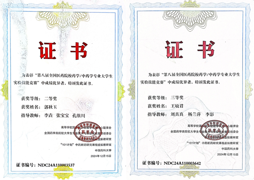 2024年12月13日-15日,由教育部高等学校国家级实验教学示范中心联席会、全国药学类院校大学生专业技术与实验技能竞赛组委会、教育部“药学课程”虚拟教研室、“101计划”中药新药研究课程虚拟教研室和中国药科大学主办,成都中医药大学承办的“第八届全国医药院校药学/中药学专业大学生实验技能展示活动”在四川成都举行。医学院2021级药学专业本科生郭秋玉、王敏君参加了此次比赛。经过长达五个小时的理论测试与技能操作两轮展示环节,郭秋玉、王敏君两名同学以优异成绩分别获得大赛的第二、三等奖。