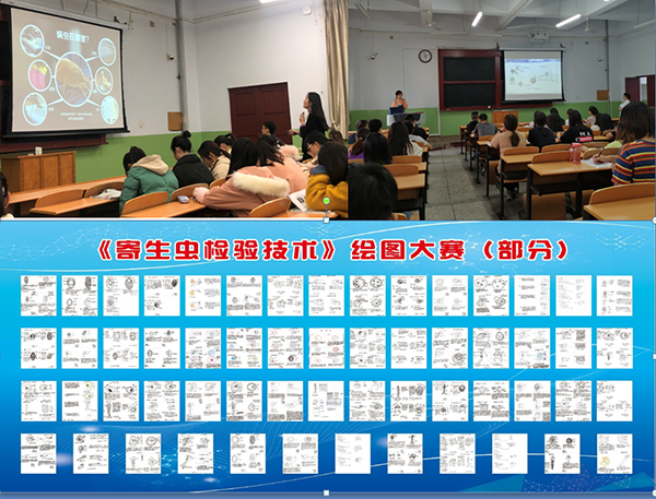 为坚持立德树人,落实“四个回归”和学校本科教育工作会议精神,围绕学生忙起来、教师强起来、管理严起来、效果实起来,医学院党委始终坚持把“立德树人”作为育人的中心环节,把思想政治工作贯彻教育教学全过程,促进教育教学工作从“以学生为中心”的落实。教师在《寄生虫检验技术》教学过程中,实施了案例教学法, 平时要求显微镜下观察虫卵、幼虫的特征并进行绘图,使理论和实验有机结合起来,提高学生的学习兴趣。2019年12月10日下午,组织2018级检验专业70名学生对寄生虫虫卵及幼虫进行绘图大赛,并评出奖项。