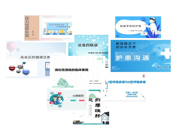 在线课堂中教师高质量的线上教学、丰富的授课资源,学生自主探究的学习方式带给参赛选手们扎实的理论功底。授课内容呈现多元化,涵盖的有消化性溃疡的临床表现、稳定型心绞痛、三叉神经痛、病毒性肝炎、腺垂体功能减退症、肿瘤病人的护理、肠梗阻病例分析、胸腔闭式引流的护理、胎盘早剥的护理、妊娠期高血压、法洛四联症、新生儿窒息、输液港、压疮的预防及护理、压力性尿失禁、护患关系、心肺复苏、热射病、火灾现场救护、精神分裂症等护理学多门课程的内容。授课手段多元化,体现在导入环节有直接切入主题、情景导入、案例导入、目标引入、视频导入;授课环节中贯穿有拓展链接、慕课视频、手绘解剖图等。