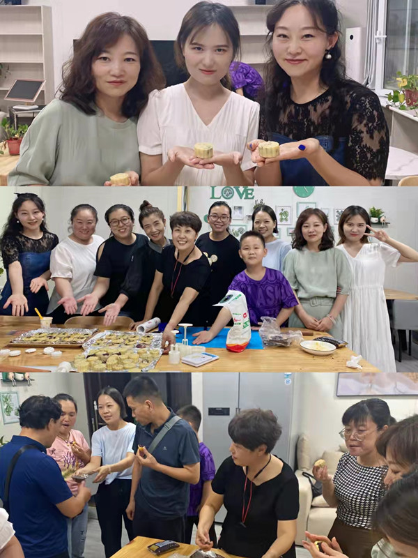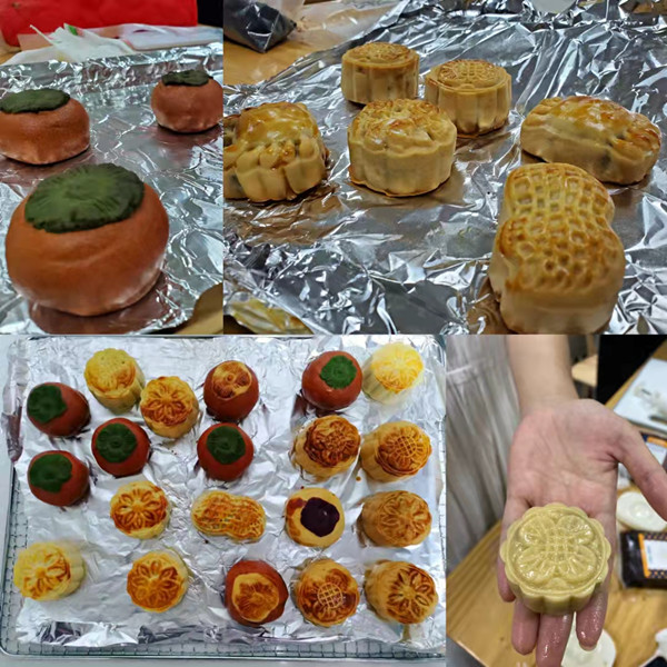 活动现场,教师党员提前将准备好的饼皮原料、各种口味的馅料、手套、模具等材料一一摆放。在学院擅长烘焙老师的指导下,大家认真的按照制作步骤精准操作,有的揉面团、有的称重、有的包馅,待压模成型成品完成的那一刻,大家看到自己第一次亲手制作的月饼,喜不自禁,成就感满满。在阵阵欢笑和真诚的夸赞声中,吸引了更多的老师参与其中。在教师党员的巧手下,一个个生动的造型跃然案上,清雅的荷花、富贵的牡丹、热烈的玫瑰、金灿灿的花生、胖嘟嘟的柿子……其中花生和柿子的月饼造型最受欢迎,不仅因为它们可爱的造型,更因为它美好的寓意“好‘柿’发‘生’”。随着烤箱炙热的烘焙,香甜的味道溢满了桂花环抱古朴的办公楼,更多的老师闻“香”而来,品尝着可口的月饼,体味着这即将到来的传统佳节蕴含的团聚之乐。