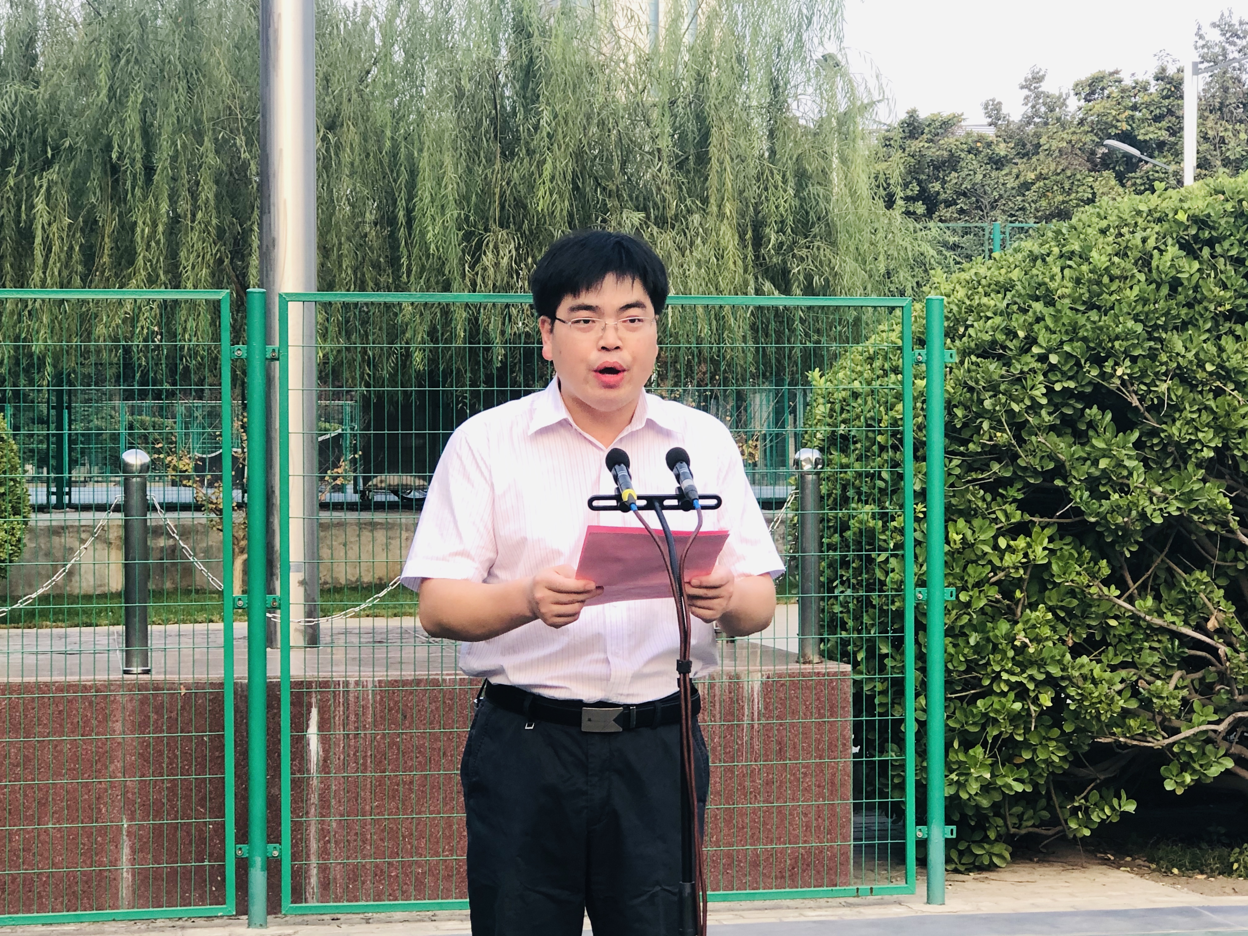 6:50分许,升旗仪式正式开始,国旗护卫队护卫着国旗,英姿飒爽,迈着铿锵有力的步伐,走上升旗台。随着主持人一声“升国旗、唱国歌”的口令,伴随着初升的太阳和雄壮的国歌,升旗手迎风振臂,鲜艳的五星红旗冉冉升起,全体师生行注目礼,向神圣的国旗致以崇高的敬意。随后,医学院郜俊华、李一鸣等20多位同学饱含深情地朗诵了《祖国,您好》,表达对祖国母亲的敬爱和祝福。医学院党委书记余本胜教授讲话,激励同学们在奋斗中释放青春激情、追逐青春理想,以青春之我、奋斗之我,为民族复兴铺桥架路,为祖国建设添砖加瓦。升国旗仪式最终在热烈的掌声中结束。