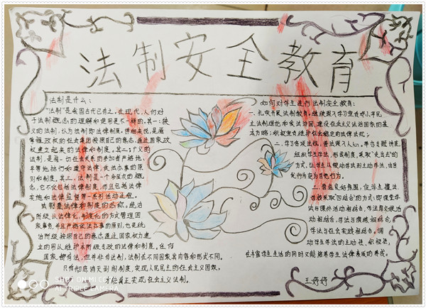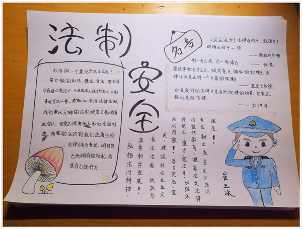 在学生中开展形式多样的法制教育学习活动。通过你问我答、个人演讲和案例分析等多种易被同学们接收的学习形式,让同学们更多、更快、更好的了解各种法律法规,进一步加大对法的宣传教育力度,增强维护法的自觉性。并通过在学生会同学中开展法制教育手抄报活动,让更多的同学学法、知法、懂法,达到法制安全教育学习的目的。