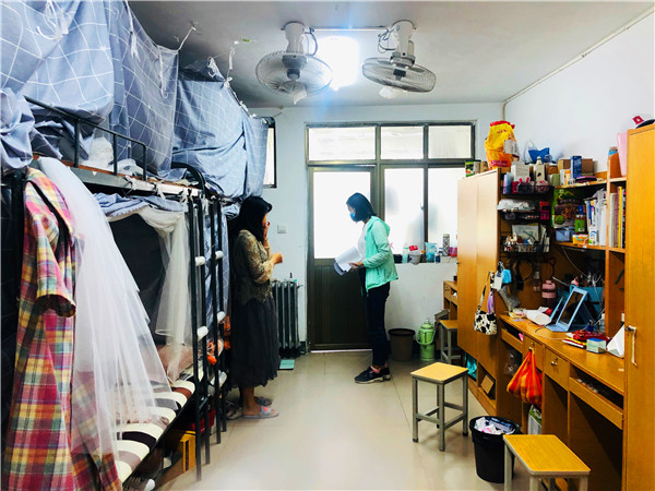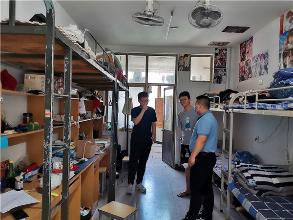 我院毕业生宿舍分别位于北校区5号公寓和7号公寓。老师们查看了宿舍学生每日晨午体温登记和张贴情况,与学生亲切交谈,询问返校后的学习、生活情况,以及毕业打算等。杜书记感谢同学们对学校疫情防控工作的充分理解和全力配合,并表示,虽然学校和学院全力以赴努力确保各项措施落实到位,如仍有不能满足需求的地方,请同学们及时联系学院和相关部门,提出意见建议,学院将尽快协调完善,确保同学们在校期间学习生活顺利。走访过程中,杜书记告诉同学们,当前我国疫情防控工作进入常态化阶段,但由于学校本身具有人员较为密集的特点,特别是教室、宿舍、餐厅等地都是人员密集性场所,防控工作仍不能放松。希望同学们认真遵守学校规定,积极做好个人防护,尽快调整状态,安排好校园学习、生活。