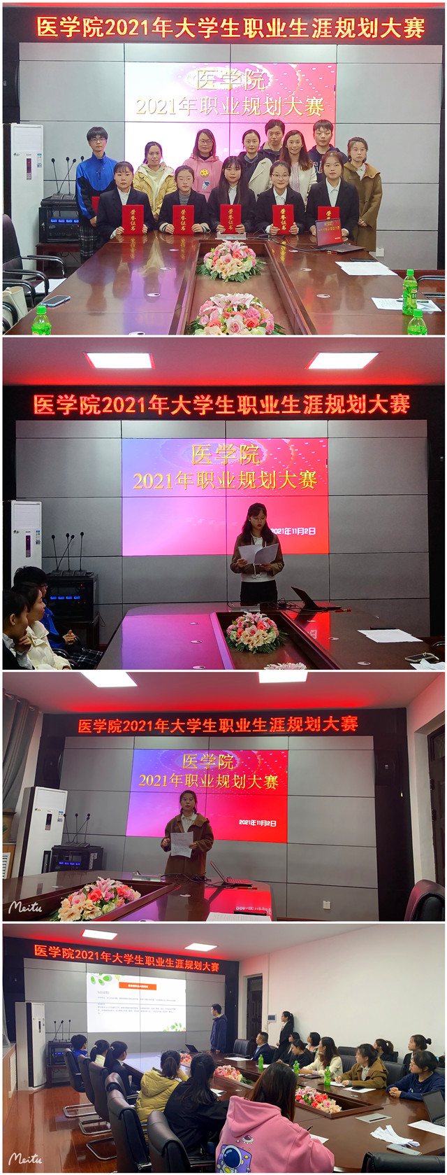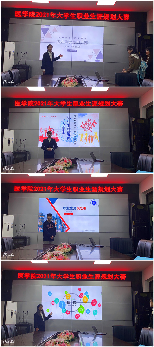 11月2日下午3点,我院2021年大学生职业生涯规划大赛在223会议室举行。本次大赛以“追梦青春·职击未来”为主题,院党委副书记杜小保、学工办主任李金丽、辅导员齐蕊、李悦、罗讯、建艺学院学工办主任尹士花6位老师和2020年参加校赛获奖的20级药学张蕊同学共7人担任评委。