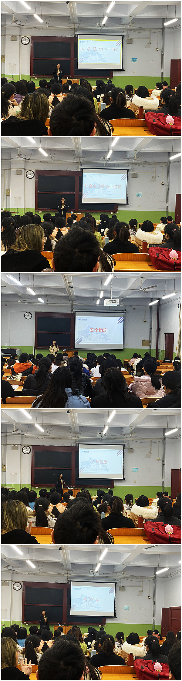 会议主要围绕学生干部的工作职责、学生干部如何带头做好思想政治引领、全面提升学院学风建设和心理健康教育四个方面展开。会议开始,李老师表示,学生干部是学生工作的组织者、协调者和执行者,加强学风建设要由学生干部带头以身作则,起到模范引领作用。并且强调了政治理论学习的重要性,要求全体学生干部深入学习习近平新时代中国特色社会主义思想和党的十九大精神,坚定中国特色社会主义道路,坚定理想信念,积极向党组织靠拢。随后,她对全体学生干部提出:作为一名学生干部,不仅是学生的领导者,更是学生的服务者,因此在平时的工作中要时刻关注班级同学的思想动态,关注同学的心理健康,发现问题及时向辅导员老师或有关部门汇报,要认真传达和落实学校学院下发的各项工作任务,配合辅导员老师做好学生的诚信教育和感恩教育,做新时代大学生。