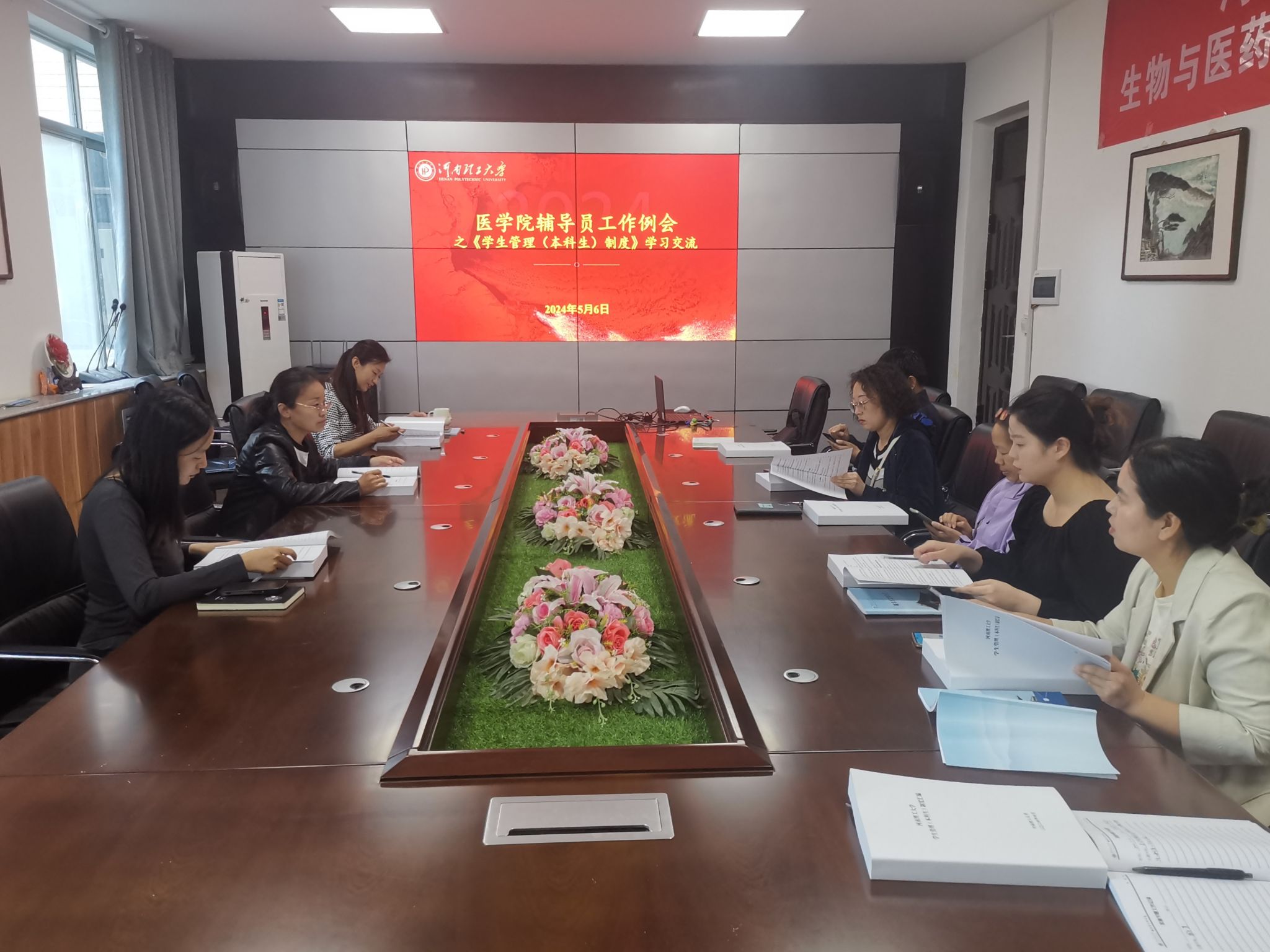 为全面贯彻落实立德树人根本任务,进一步加强学生管理工作,5月6日上午9:00时,在医学院223会议室召开辅导员工作例会之《学生管理(本科生)制度》交流学习专题会议。会议由医学院党委副书记朱丹主持,所有专兼职辅导员参加。