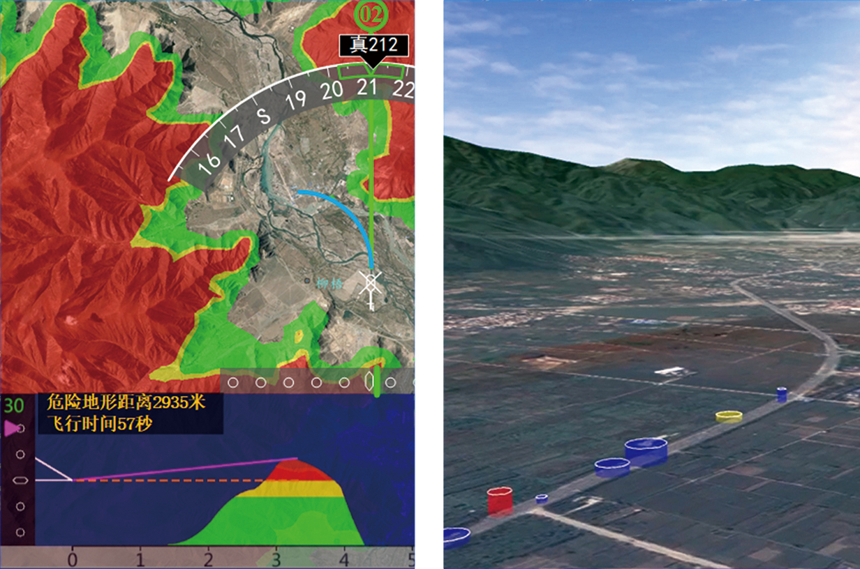 基于三维地理信息,对航线航迹、领航参数、引导指令、障碍物进行三维融合,提供多视角、多场景可视化导航模型,具备地形、障碍物碰撞告警功能,可支持多策略、多场景下自动路径规划,极大的提升了飞行员对地形环境的感知能力。